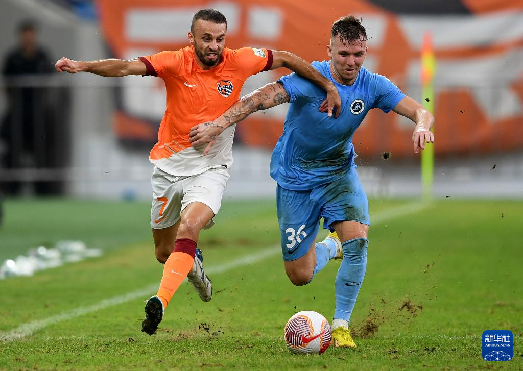 8月17日,深圳新鹏城队球员卡尔采夫(右)在比赛中与青岛海牛队球员萨里奇拼抢。新华社记者 李紫恒 摄