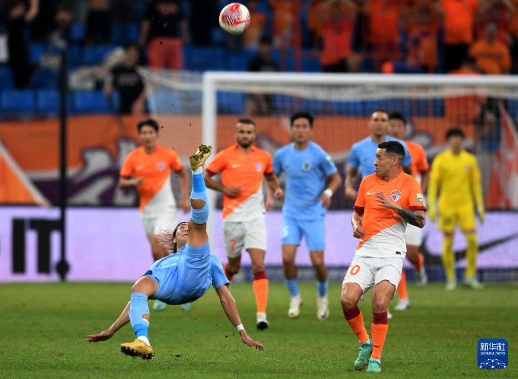 8月17日,深圳新鹏城队球员李智(前左)在比赛中射门。新华社记者 李紫恒 摄