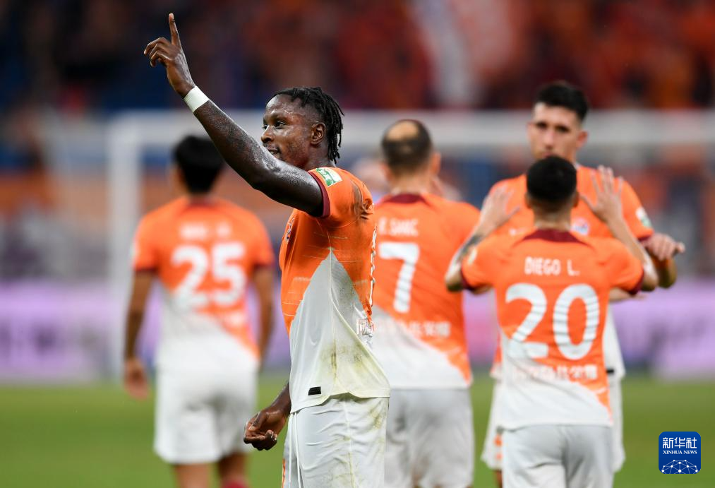 8月17日,青岛海牛队球员博阿基耶(前)在比赛中庆祝进球。新华社记者 李紫恒 摄