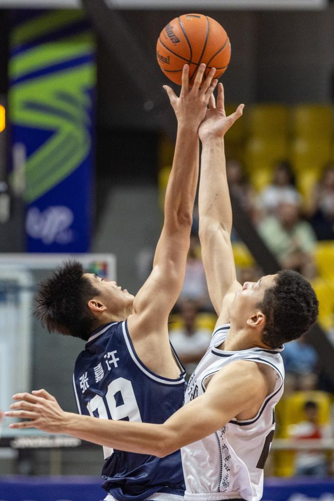 8月18日,浙江稠州银行队球员张嘉许(左)与天津荣钢队球员李宗霖在比赛中跳球。新华社记者 黄伟 摄