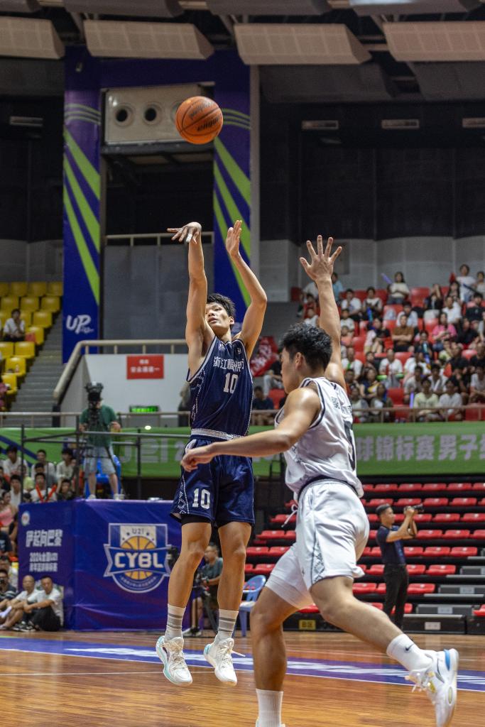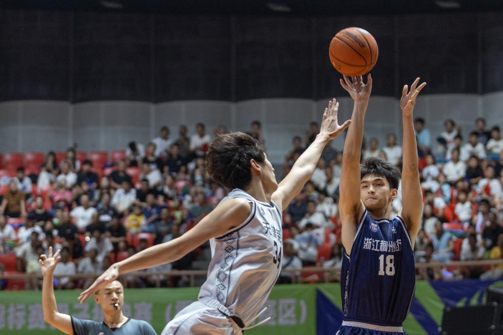 8月18日,浙江稠州银行队球员景天雨(右)在比赛中投篮。新华社记者 黄伟 摄