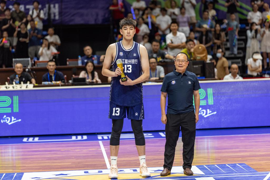 8月18日,浙江稠州银行队球员张洪硕(左)获评最有价值球员(MVP)。新华社记者 黄伟 摄