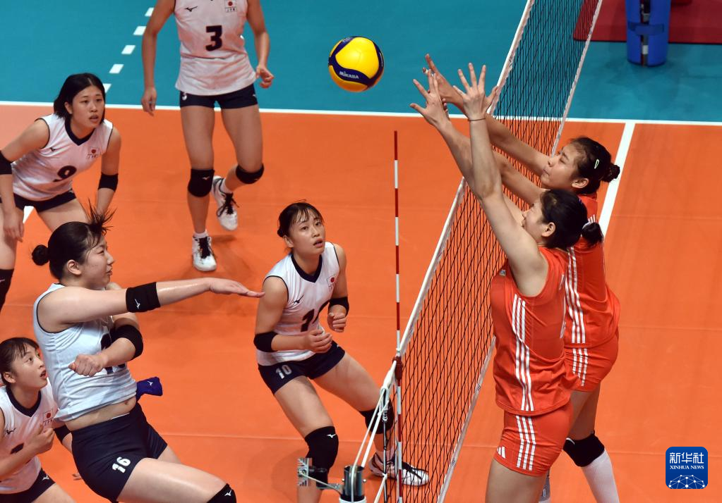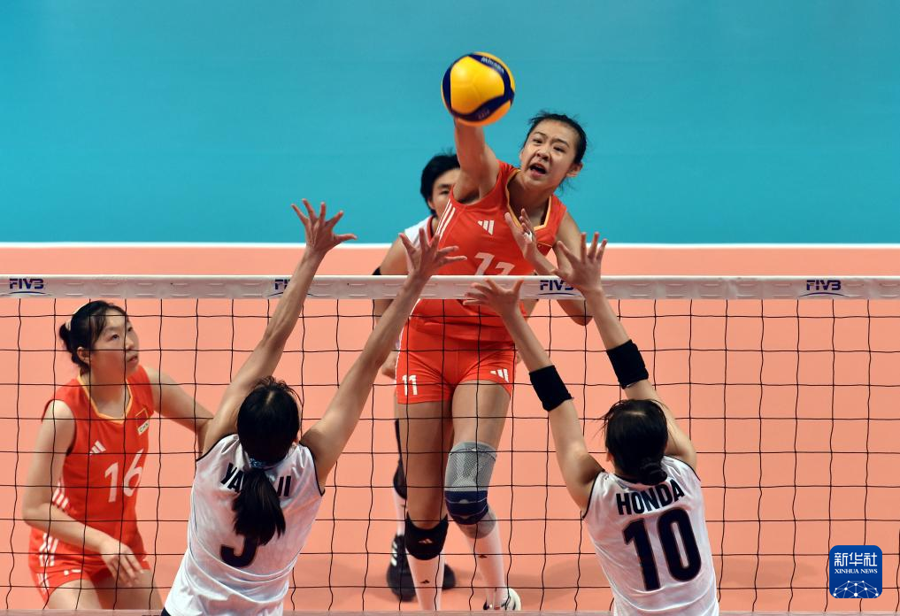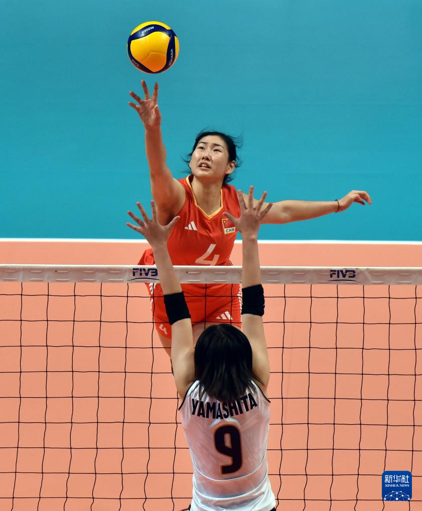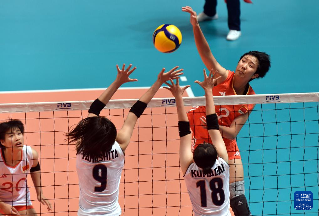 8月18日,中国队球员董禹含(右一)在比赛中扣球。新华社记者 卢炳辉 摄