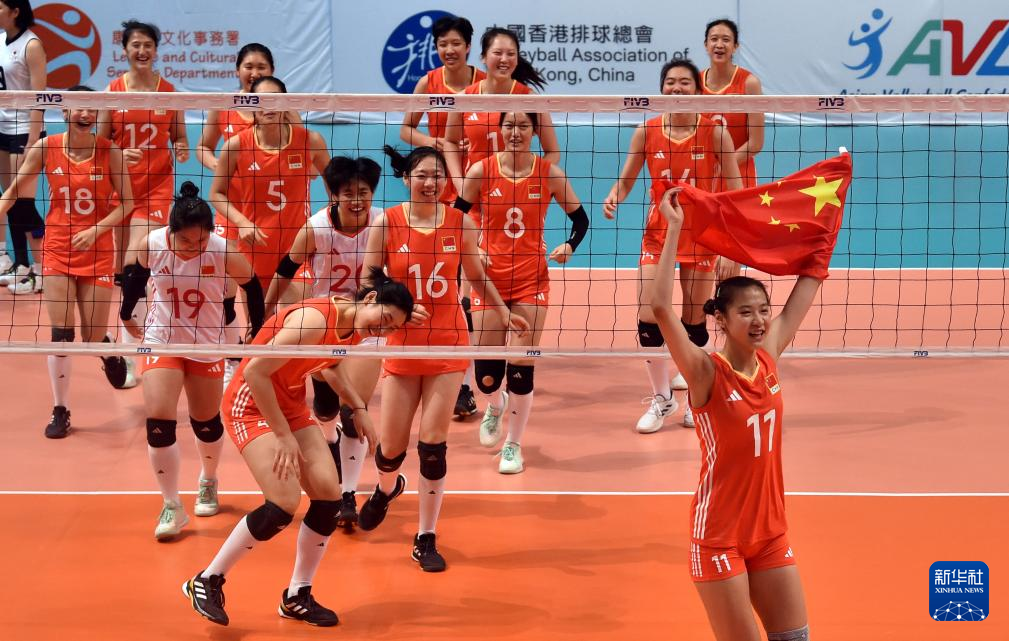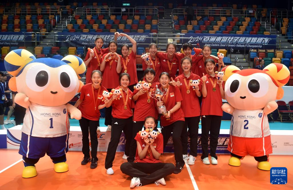 当日,在香港伊利沙伯体育馆举行的2024亚洲东区女子排球锦标赛决赛中,中国队3比0战胜日本队,获得冠军。