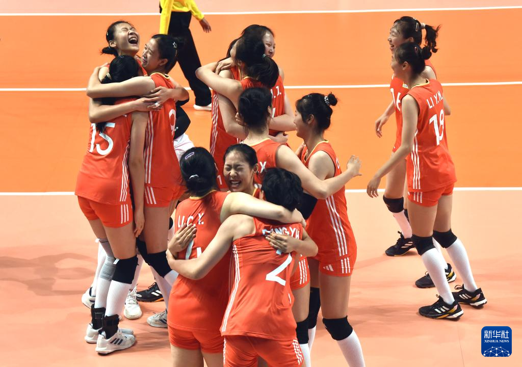8月18日,中国队球员王奧芊(前右)庆祝获胜。新华社记者 卢炳辉 摄