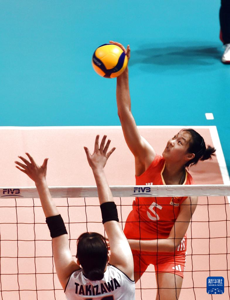 8月18日,中国队球员王奧芊(上)在比赛中扣球。新华社记者 卢炳辉 摄