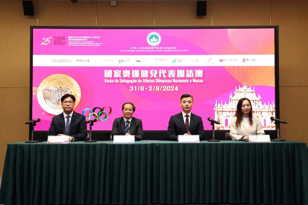澳门特区政府体育局当天举行新闻发布会,介绍代表团访澳详情。据介绍,代表团将于31日从香港出发前往澳门,访澳期间将出席由特区政府举办的欢迎活动,并与澳门运动员及青少年互动交流,参与大型联欢晚会,参观地标景点,以及到社区探访等,让澳门市民有机会近距离欣赏奥运健儿的风采。