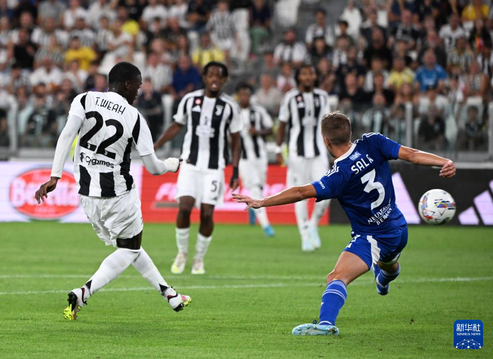 8月19日,尤文图斯队球员姆班古拉(中)在比赛中射门得分。新华社发(阿尔贝托·林格利亚摄)