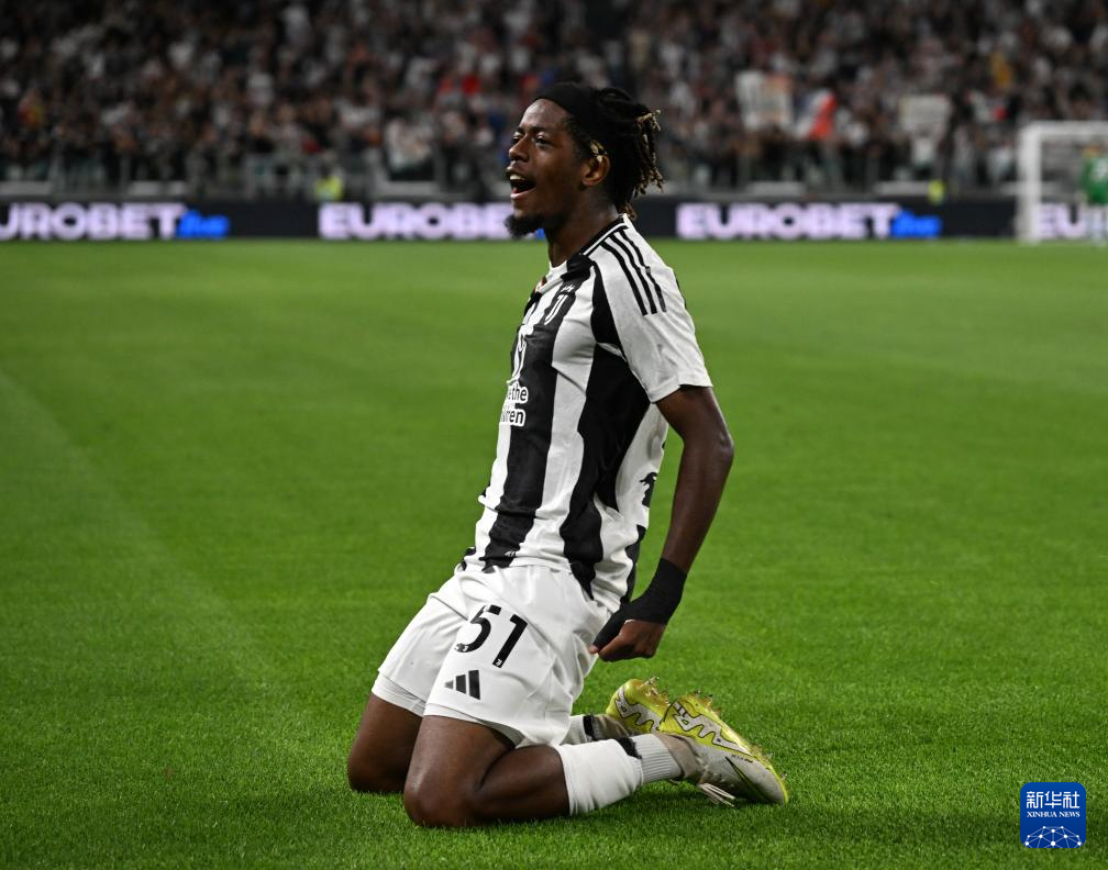 8月19日,尤文图斯队球员姆班古拉在比赛中庆祝进球。新华社发(阿尔贝托·林格利亚摄)