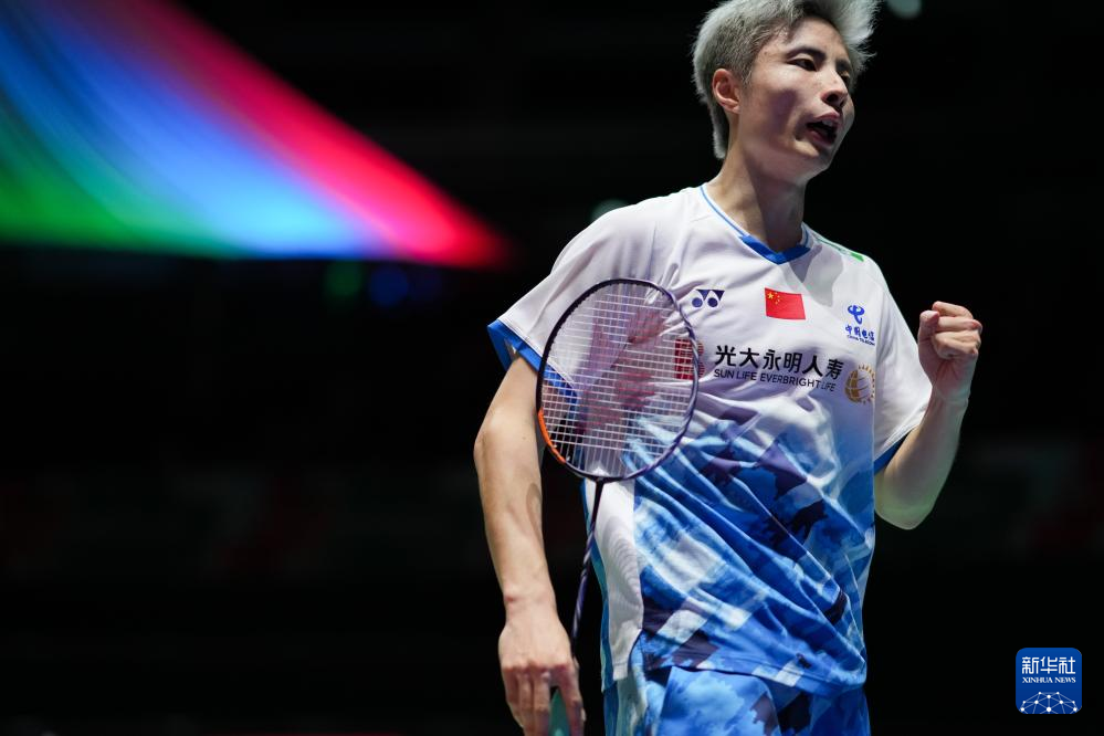 8月22日,石宇奇在比赛中庆祝得分。新华社记者 张笑宇 摄