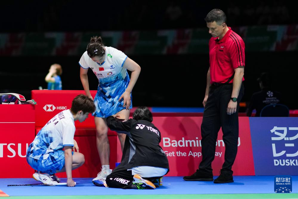 8月21日,中国选手坑姝良(左二)受伤后在场边接受治疗。新华社记者 张笑宇 摄