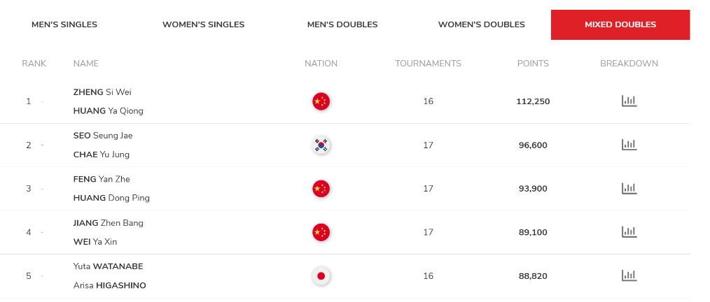 渡边勇大/东野有纱现世界排名第五。图片来自世界羽联官网