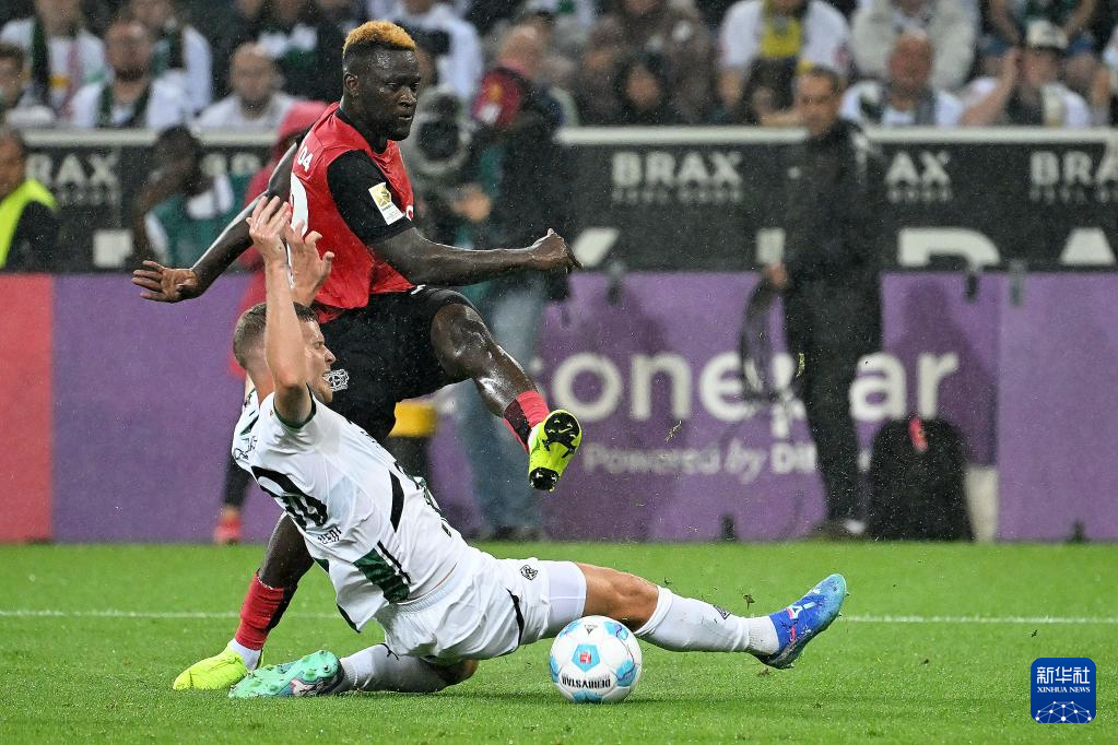 8月23日,门兴格拉德巴赫队球员埃尔维迪(右)与勒沃库森队球员博尼费斯在比赛中拼抢。新华社发(乌尔里希·胡夫纳格尔摄)