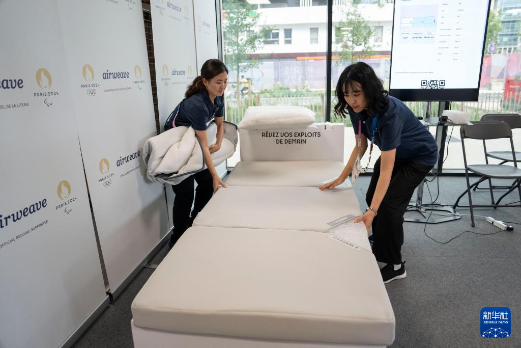 8月24日,巴黎残奥村工作人员展示可回收床架和床垫。新华社记者 才扬 摄