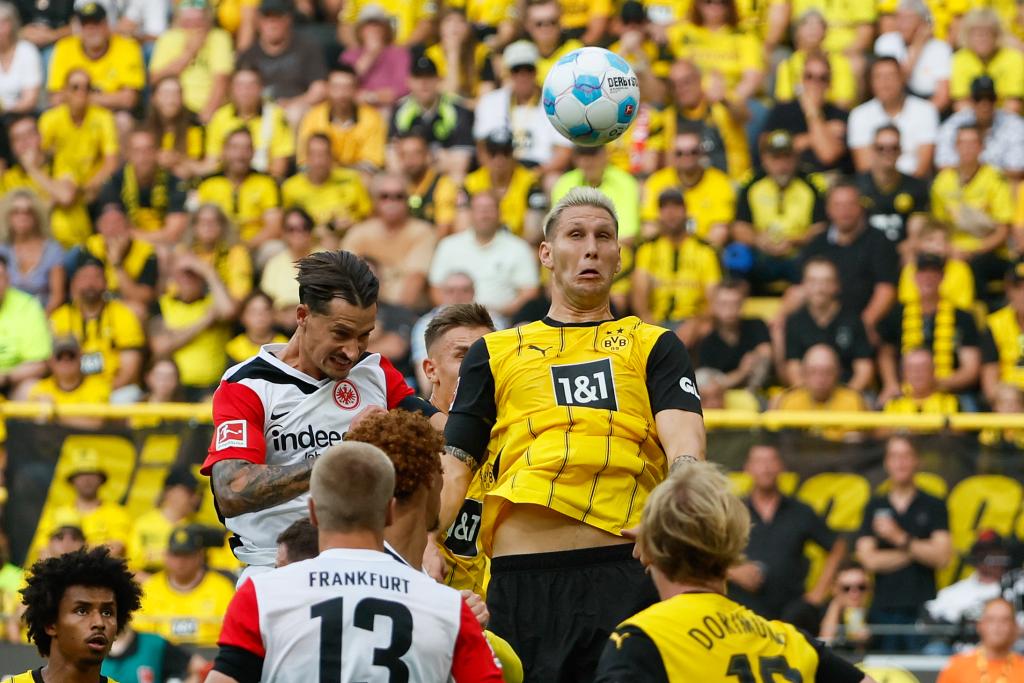 8月24日,多特蒙德队球员聚勒(上右)与法兰克福队球员科赫(上左)在比赛中争顶。