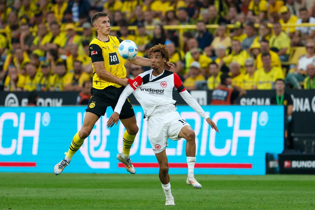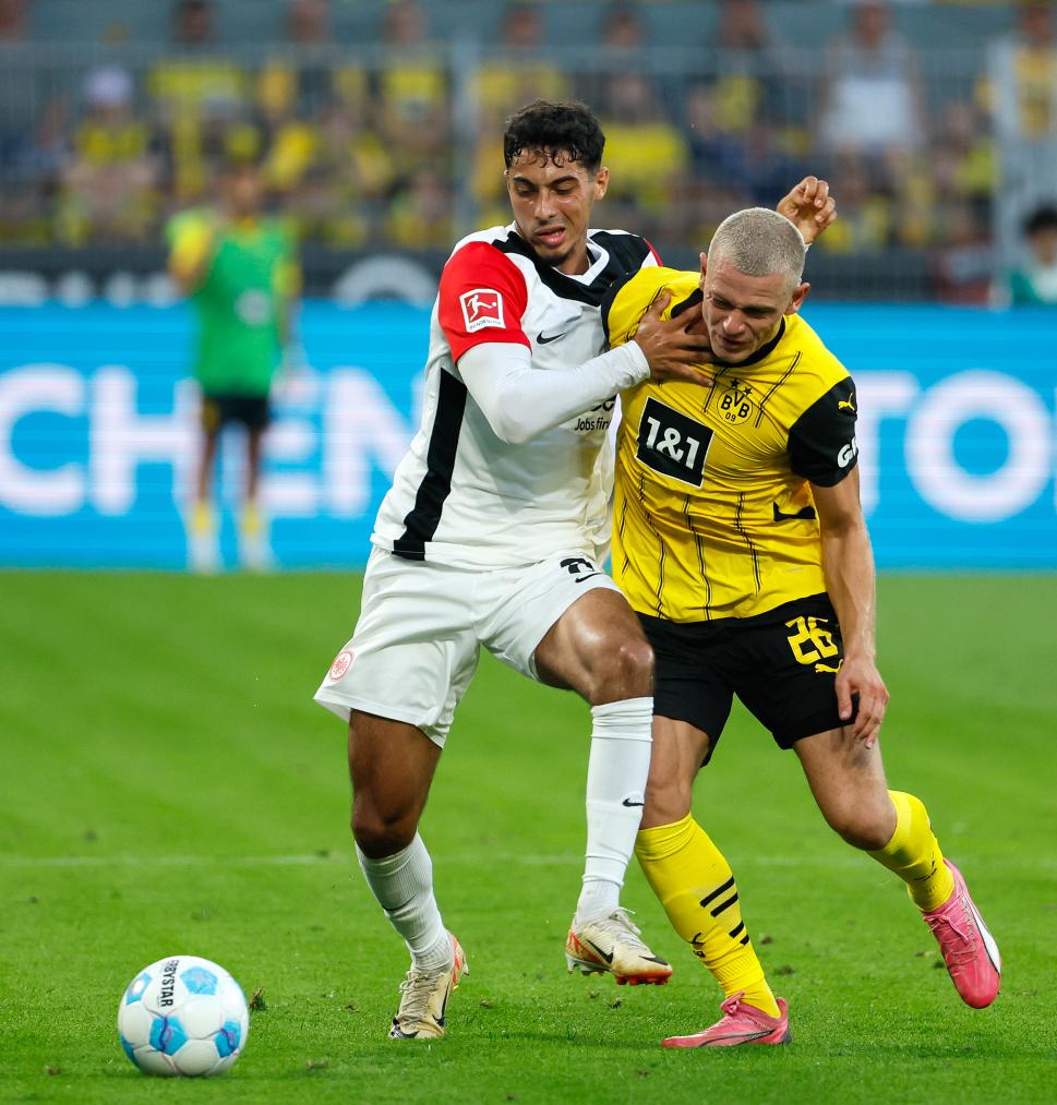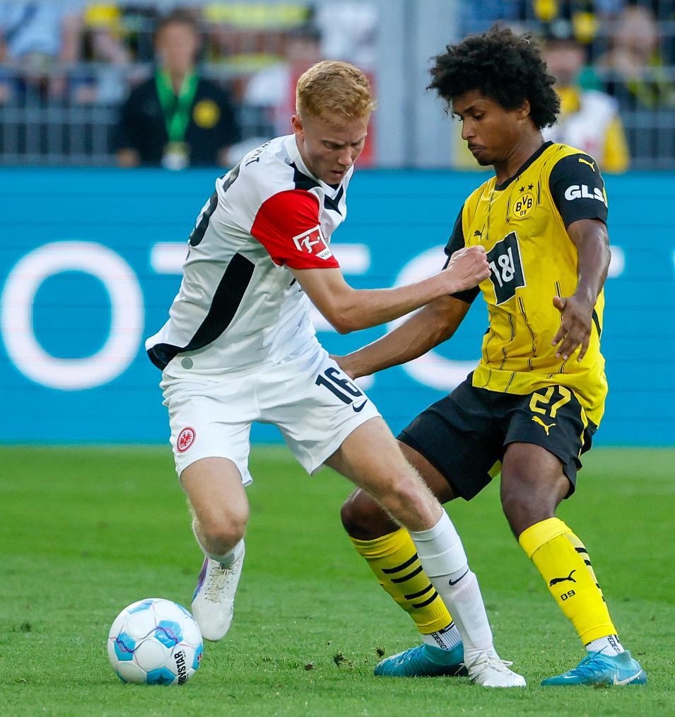 8月24日,多特蒙德队球员瑞尔森(右)与法兰克福队球员沙伊比在比赛中拼抢。