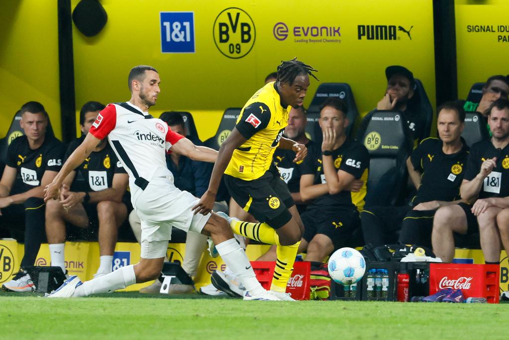 8月24日,多特蒙德队球员阿德耶米(右)与法兰克福队球员拉松在比赛中拼抢。
