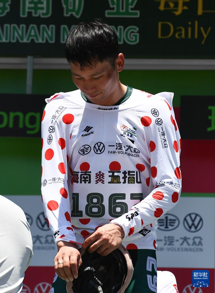 8月27日,五指山1867车队车手薛超华获得代表爬坡总积分第一名的圆点衫。新华社记者 杨冠宇 摄