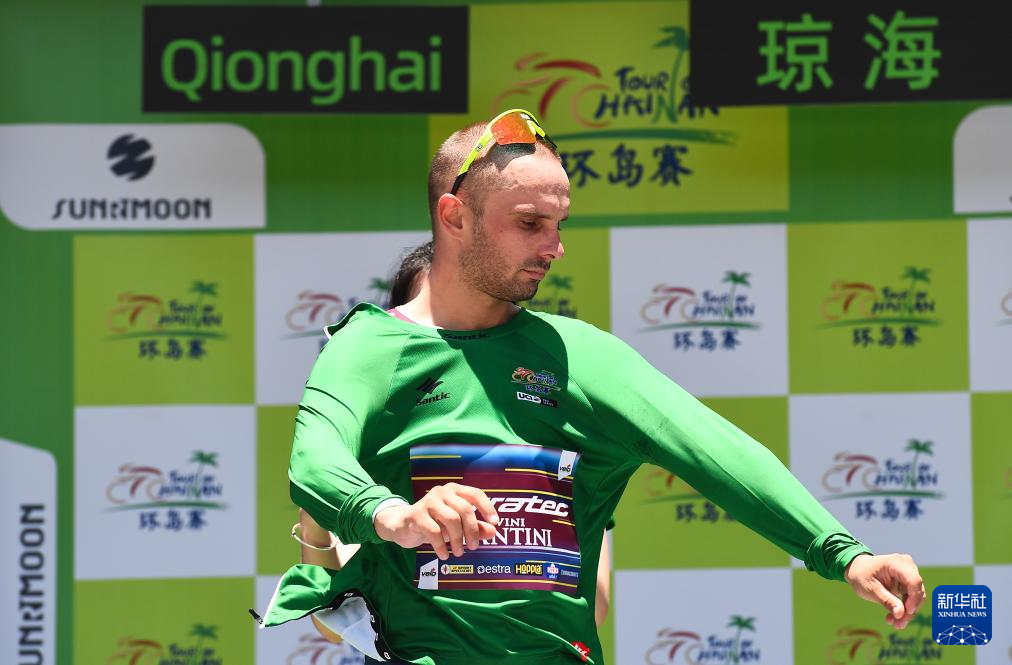 8月27日,意大利克罗蒂克车队车手雅各布·马雷奇科获得代表冲刺总积分第一名的绿衫。新华社记者 杨冠宇 摄
