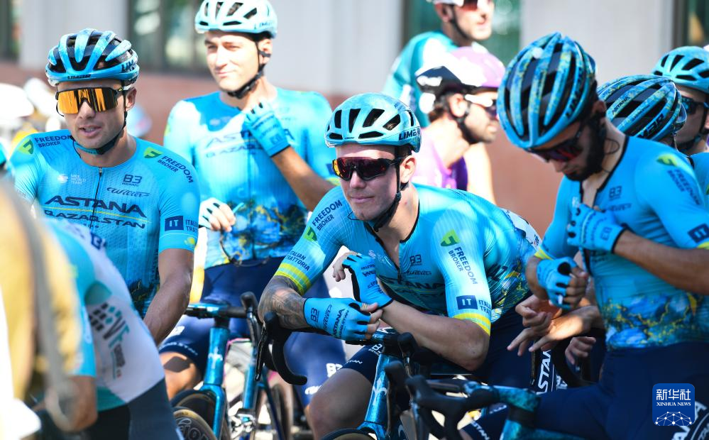 8月27日,哈萨克斯坦阿斯塔纳车队车手等待签到。新华社记者 杨冠宇 摄
