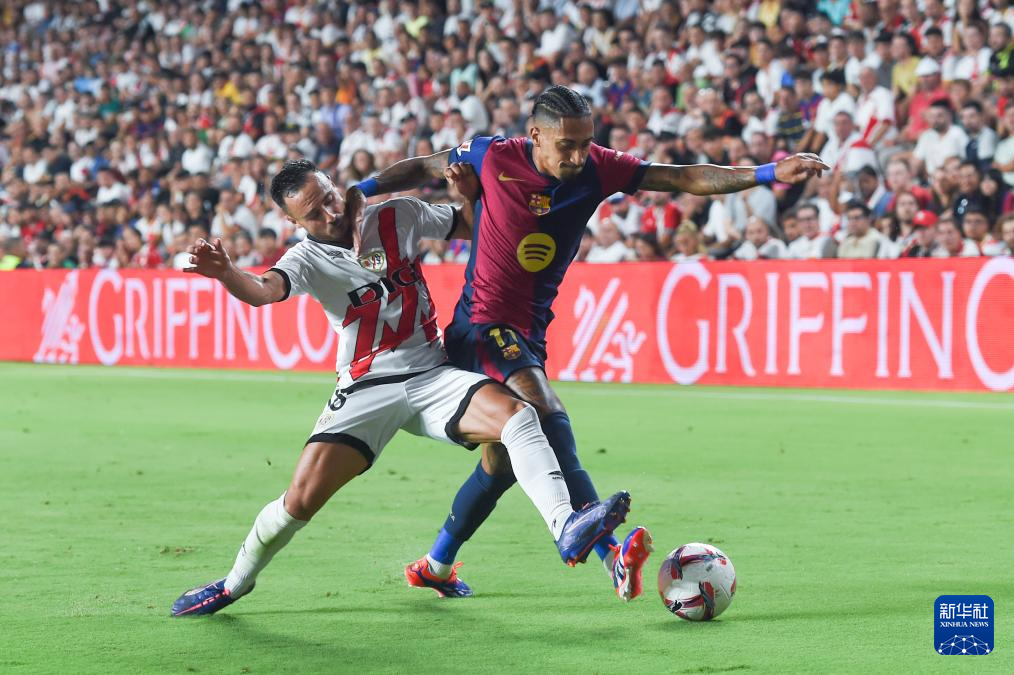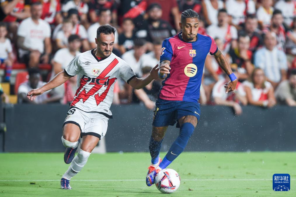 8月27日,巴塞罗那队球员拉菲尼亚(右)与巴列卡诺队球员阿尔瓦罗·加西亚在比赛中拼抢。新华社发(古斯塔沃·巴连特摄)