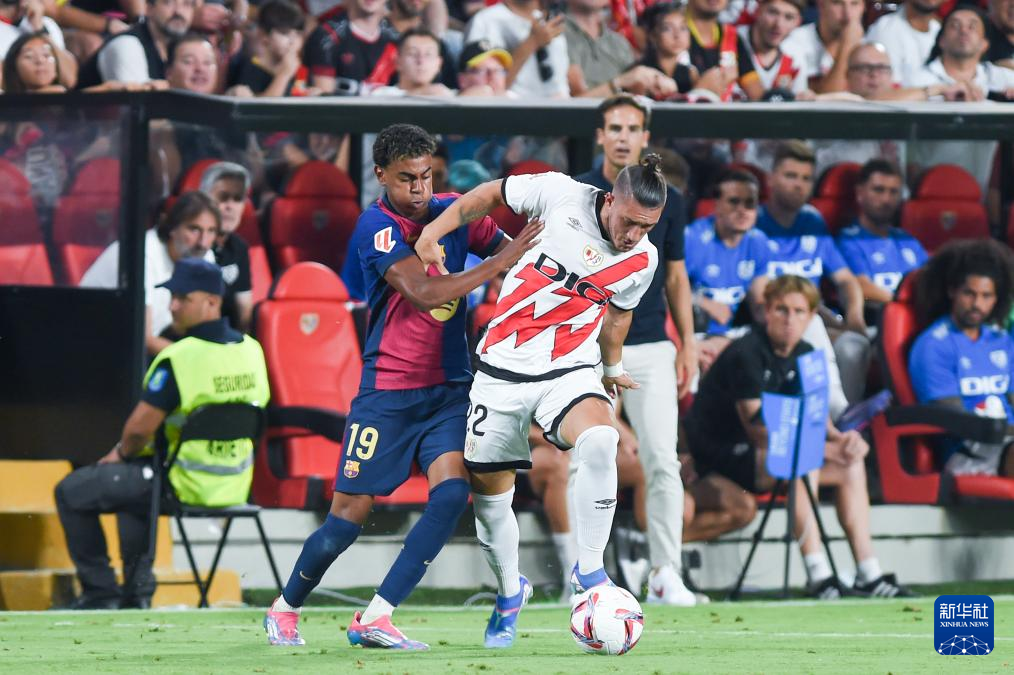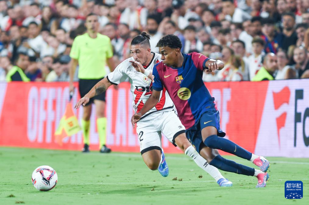8月27日,巴塞罗那队球员亚马尔(左)与巴列卡诺队球员埃斯皮诺在比赛中拼抢。新华社发(古斯塔沃·巴连特摄)