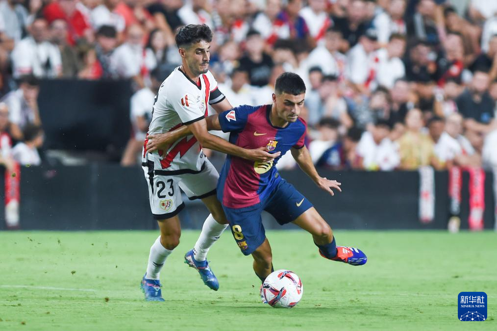8月27日,巴塞罗那队球员佩德里(右)与巴列卡诺队球员巴伦廷在比赛中拼抢。新华社发(古斯塔沃·巴连特摄)