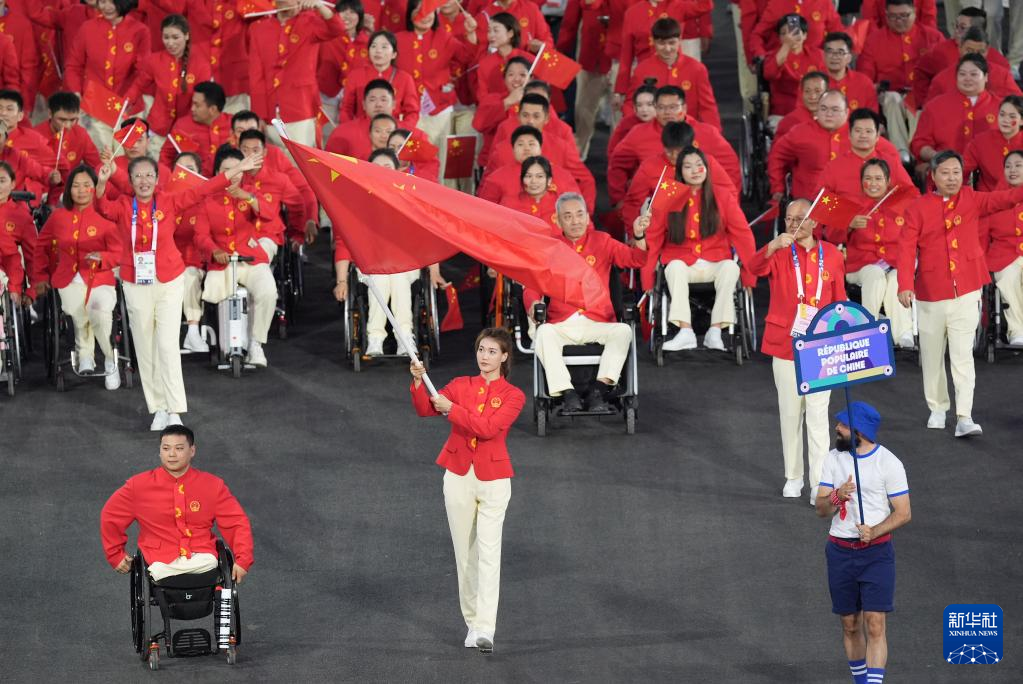 8月28日,中国体育代表团旗手女子轮椅击剑运动员辜海燕在开幕式上。新华社记者 张铖 摄