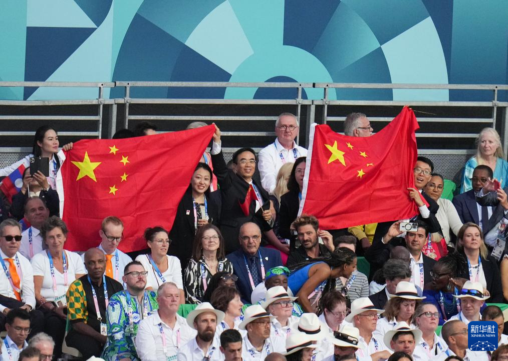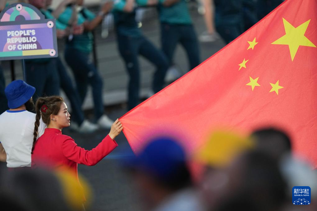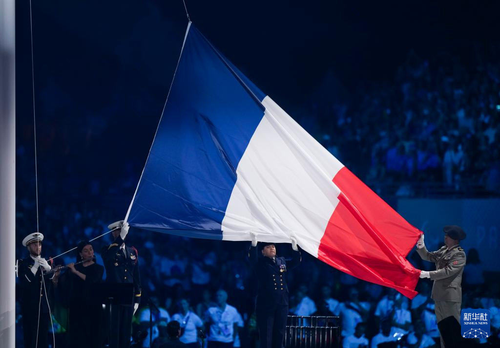 8月28日,法国国旗在开幕式现场升起。新华社记者 张铖 摄