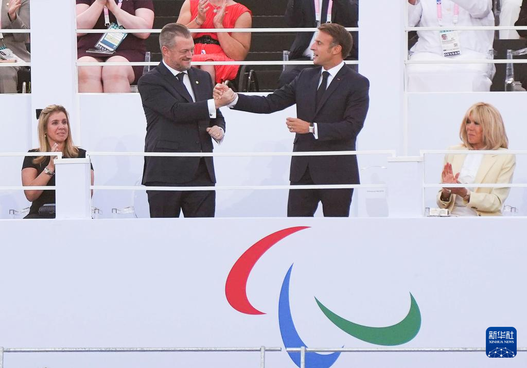 8月28日,国际残奥委会主席安德鲁·帕森斯(左二)与法国总统马克龙(右二)相互致意。新华社记者 邢广利 摄