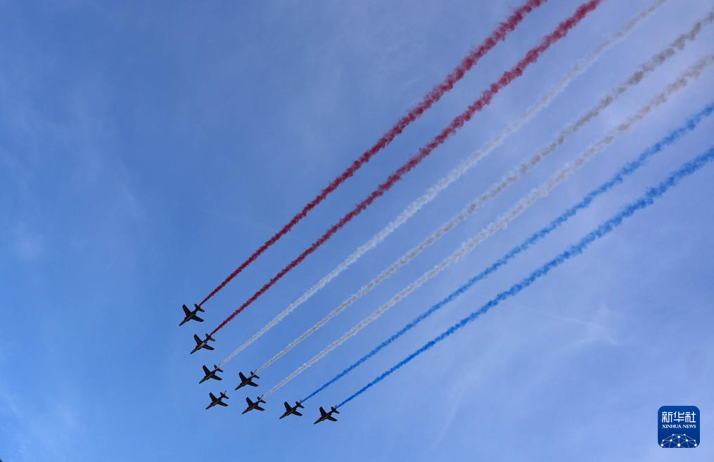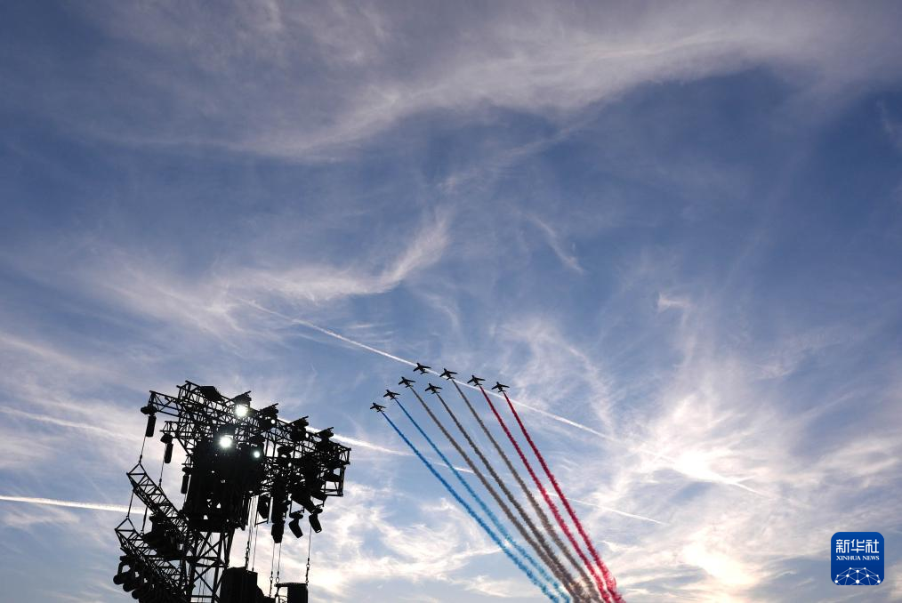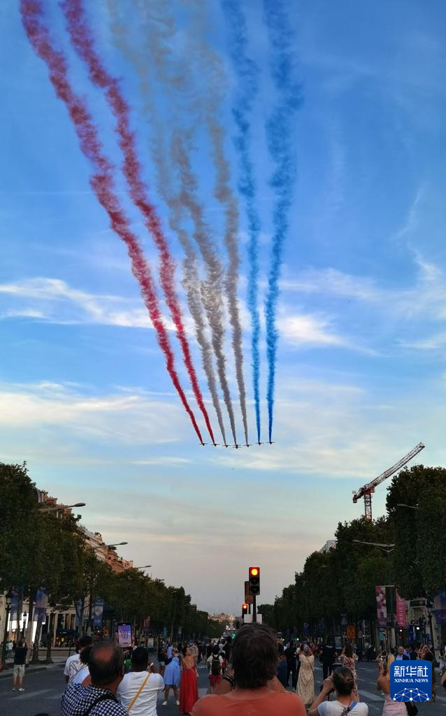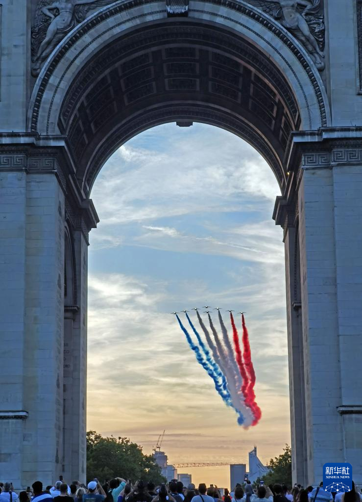 8月28日,这是在巴黎凯旋门拍摄的开幕式飞行表演。新华社发(薛庆国摄)