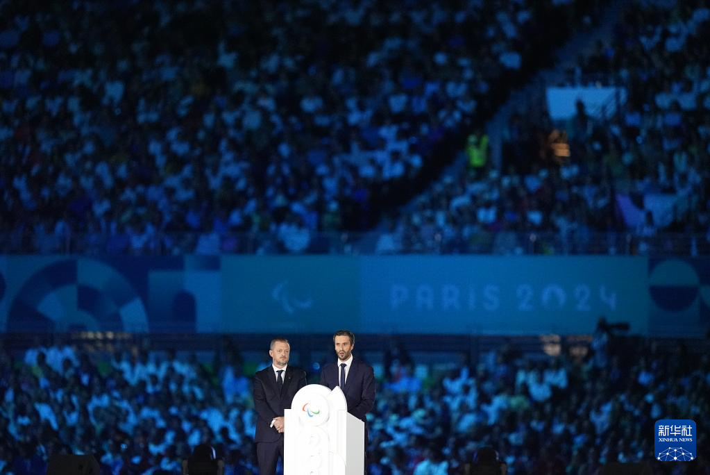 8月28日,国际残奥委会主席安德鲁·帕森斯(左)与巴黎奥组委主席托尼·埃斯坦盖在开幕式上。新华社记者 高静 摄