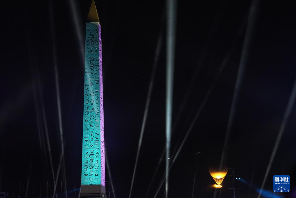 8月28日,在开幕式上,法国国旗被投射到巴黎协和广场方尖碑上。新华社记者 高静 摄
