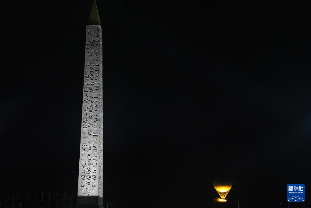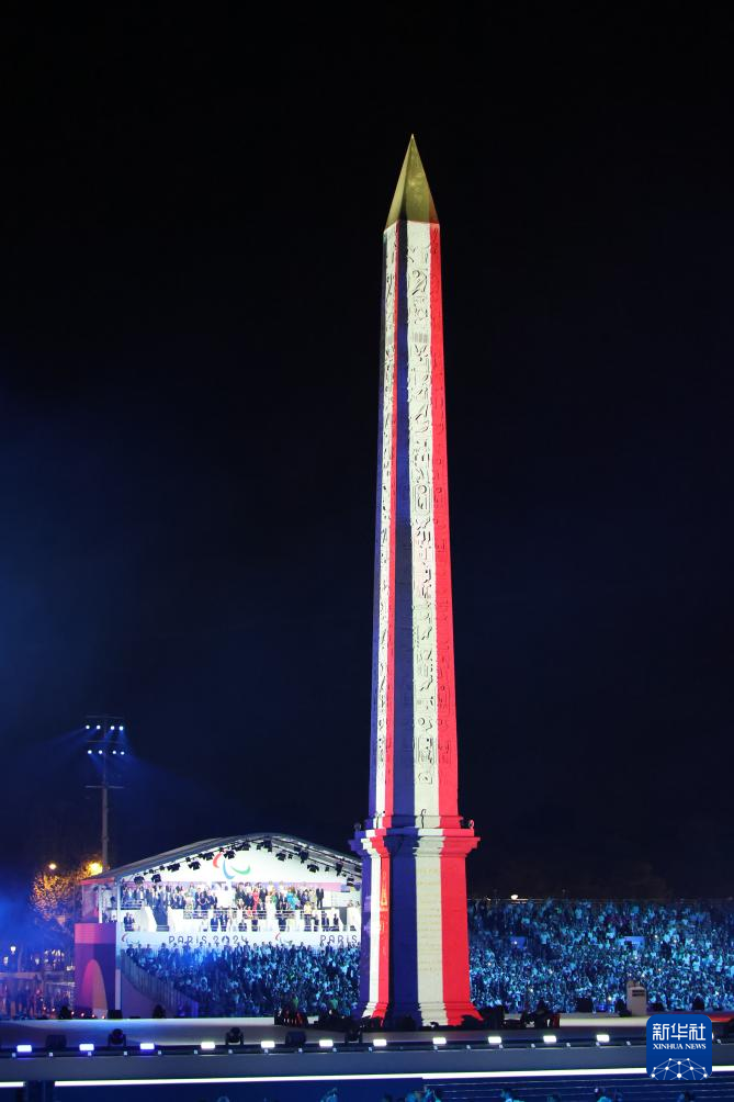 8月28日,在开幕式上,法国国旗被投射到巴黎协和广场方尖碑上。新华社记者 侯俊 摄