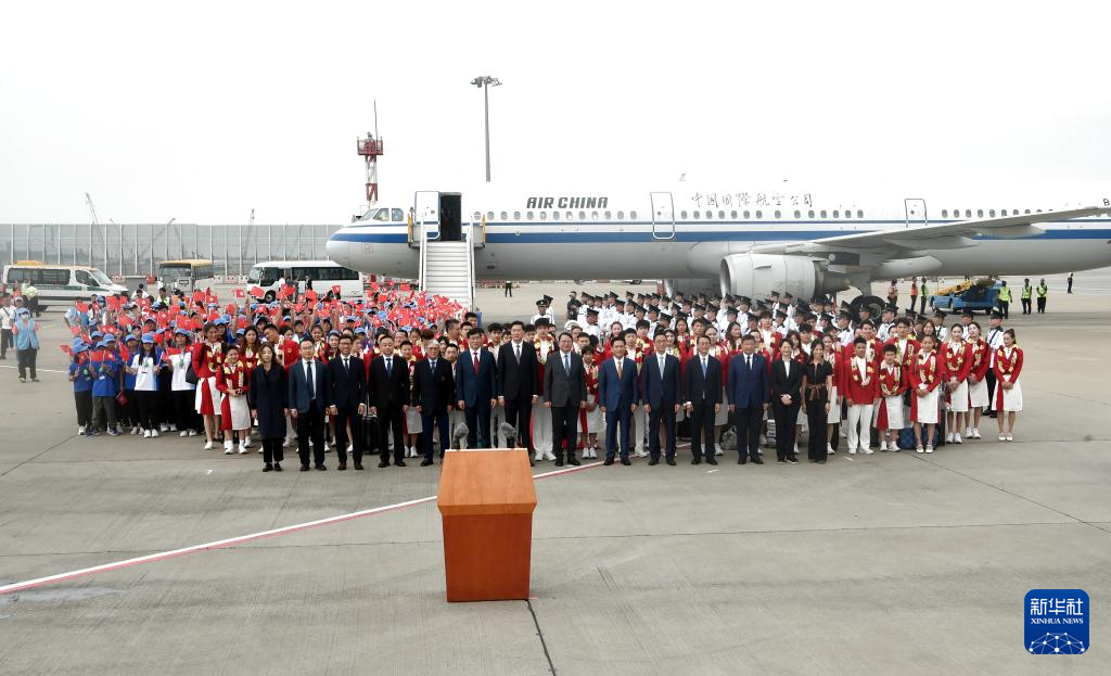 8月29日,巴黎奥运会内地奥运健儿代表团在香港国际机场停机坪合影。