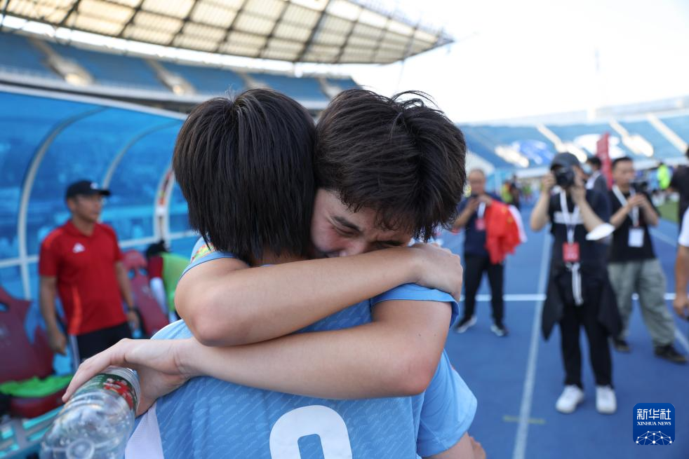 8月30日,济南市历城第二中学队球员孟雅慧(前)和队友张雪琪在赛后拥抱。