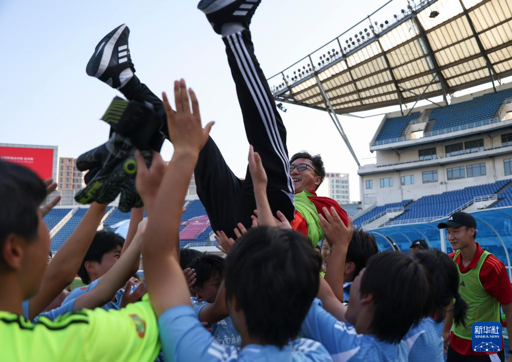 8月30日,济南市历城第二中学队球员在夺冠后将主教练姚波抛起庆祝。