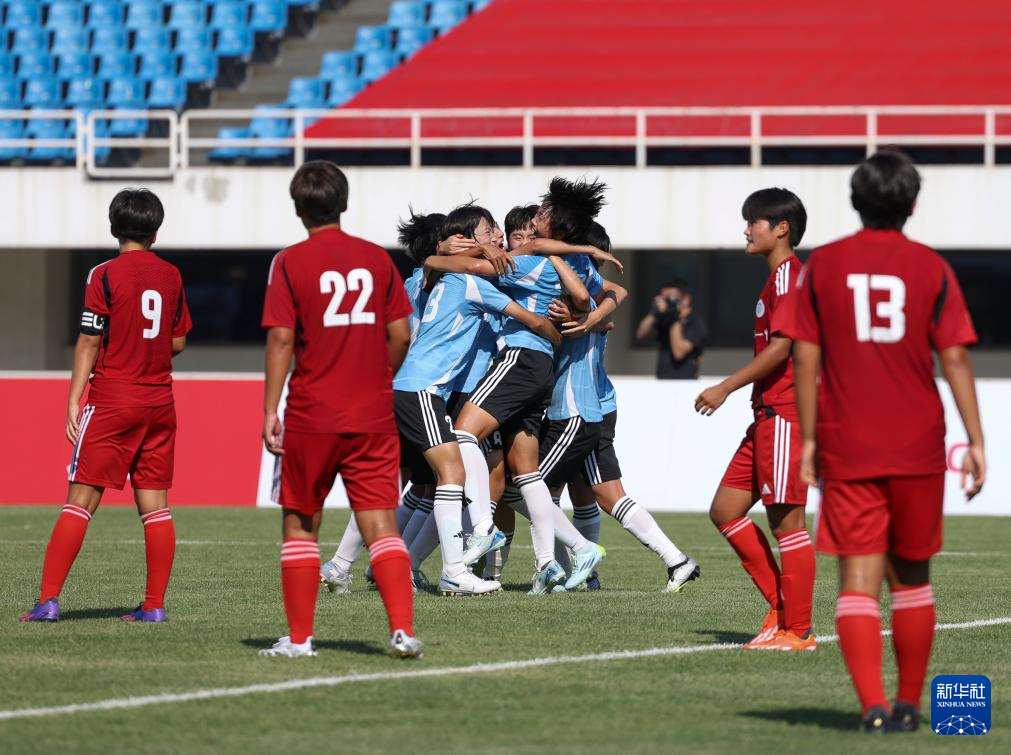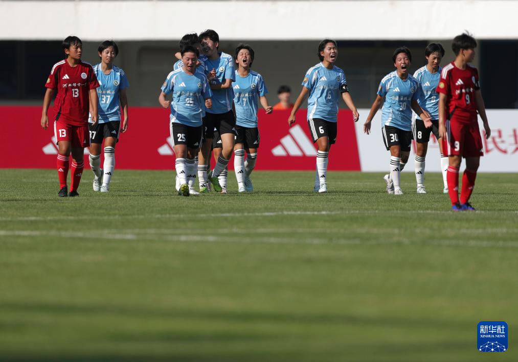 8月30日,济南市历城第二中学队球员步玉莹(左四)进球后和队友庆祝。