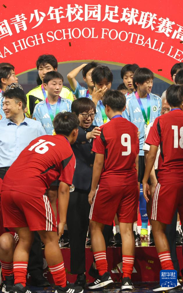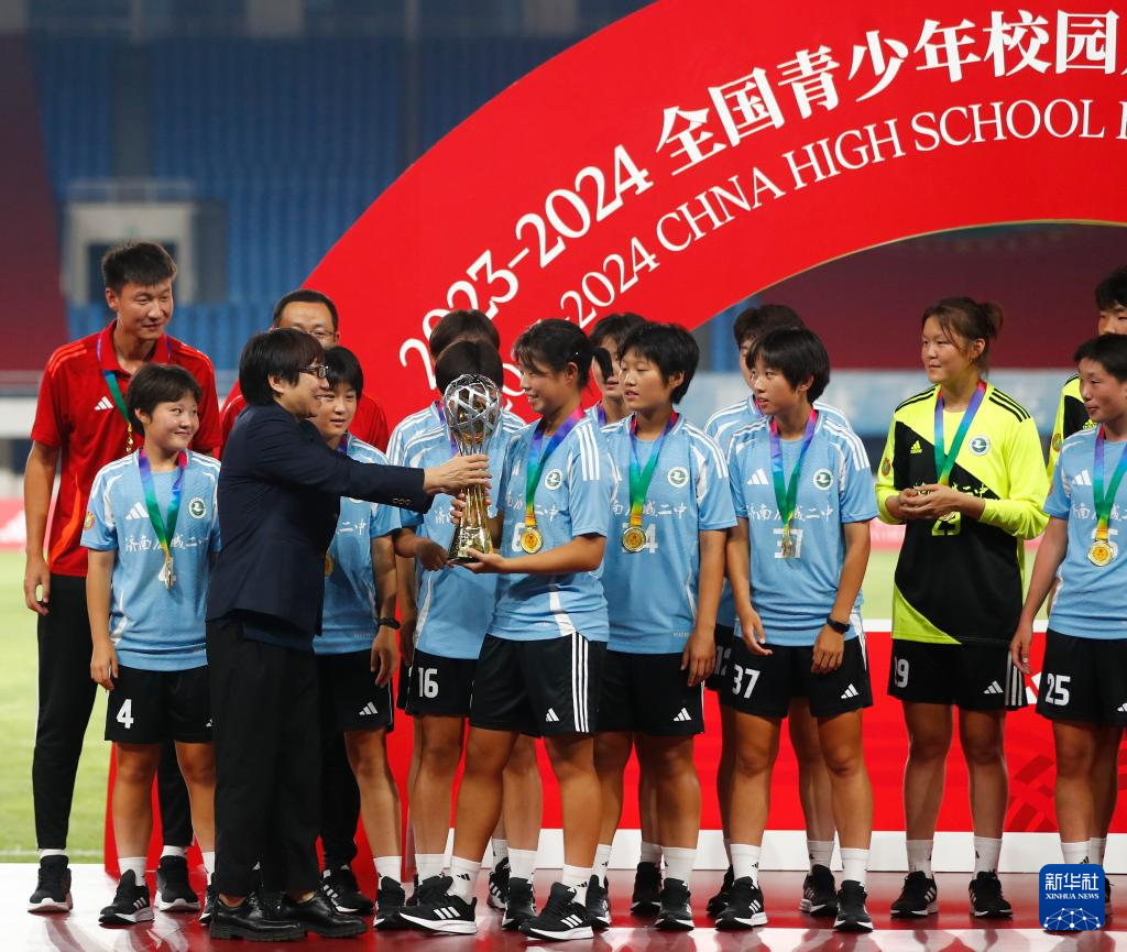 8月30日,中国足球协会副主席孙雯(左三)在颁奖仪式上为冠军济南市历城第二中学队颁发奖杯。