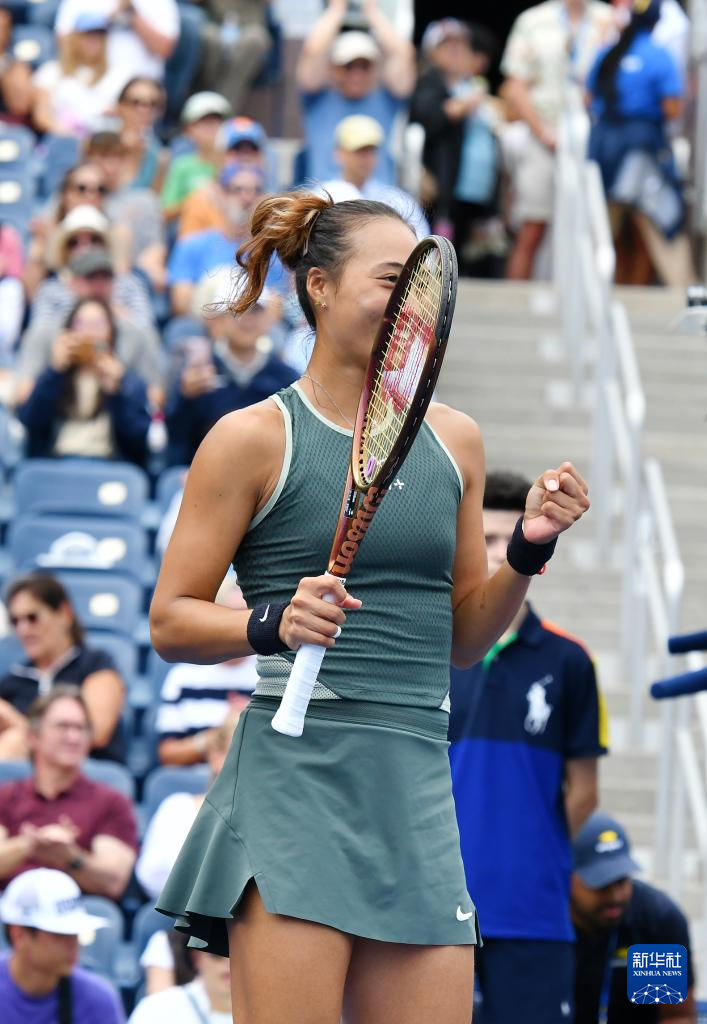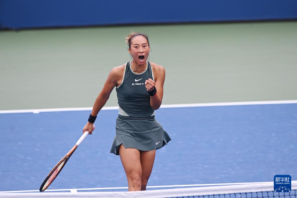 8月30日,郑钦文在比赛后庆祝胜利。新华社记者 李睿 摄