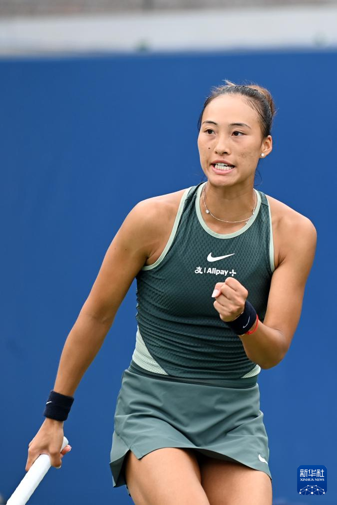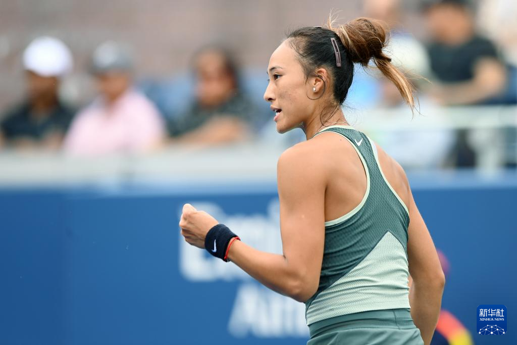 8月30日,郑钦文在比赛中庆祝得分。新华社记者 李睿 摄