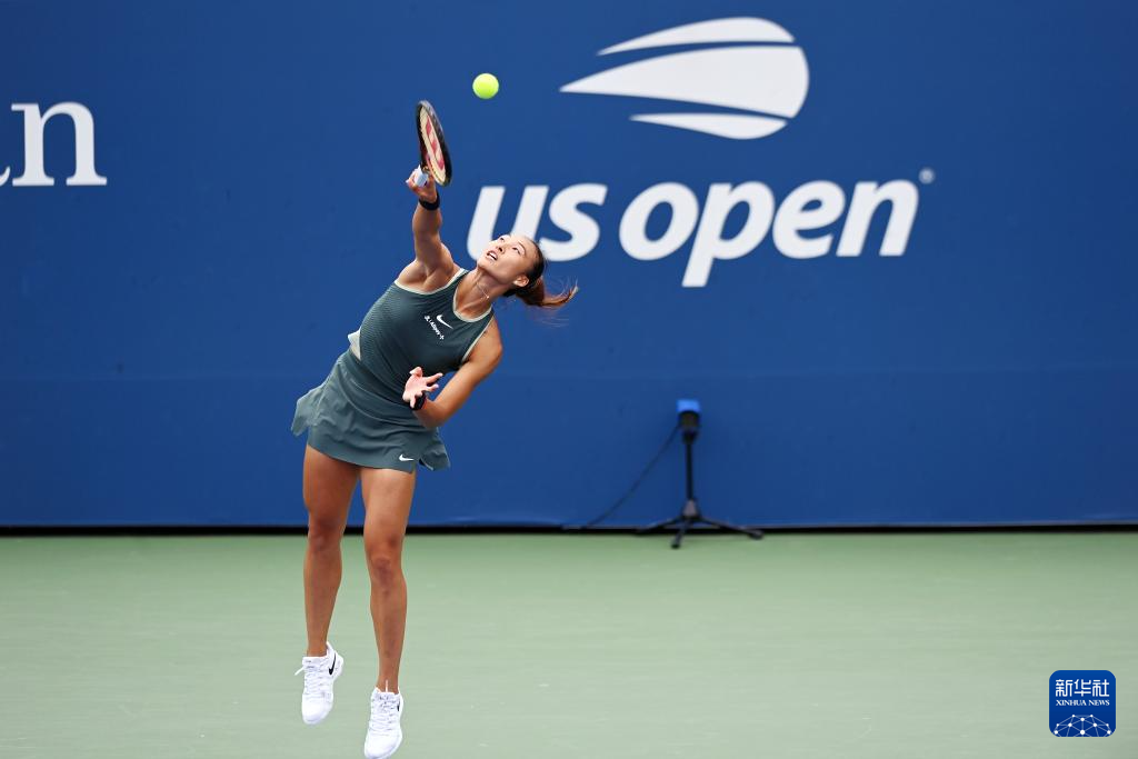 8月30日,郑钦文在比赛中发球。新华社记者 李睿 摄