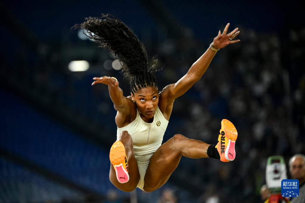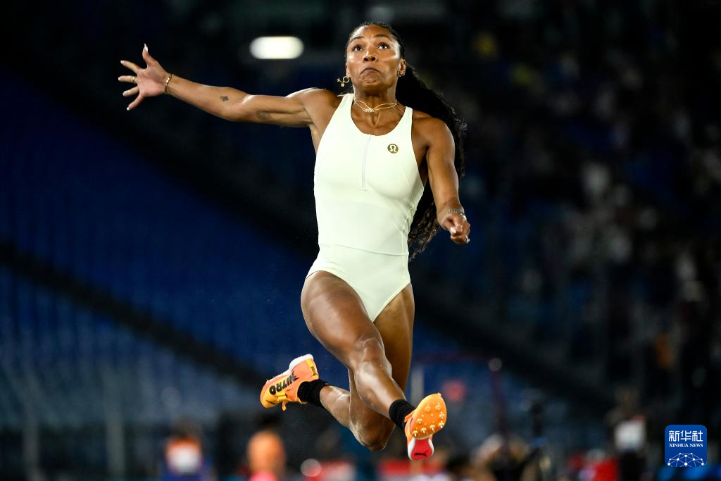 8月30日,美国选手戴维斯-伍德霍尔在女子跳远决赛中。她以7米02的成绩夺得冠军。新华社发(安德烈亚·斯塔乔利摄)