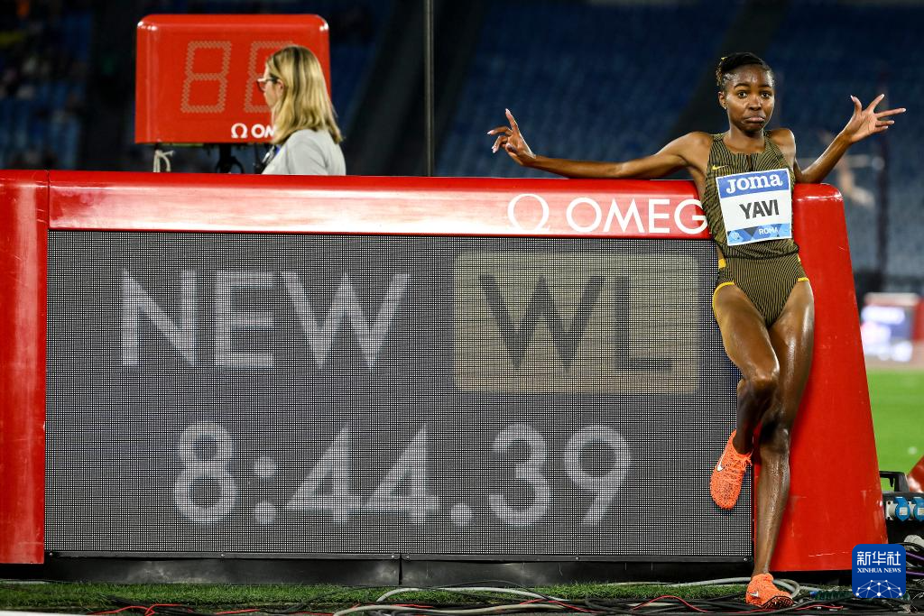 8月30日,巴林选手亚维在女子3000米障碍决赛后与自己创造的今年世界最好成绩板合影。她以8分44秒39的成绩夺得冠军。新华社发(安德烈亚·斯塔乔利摄)