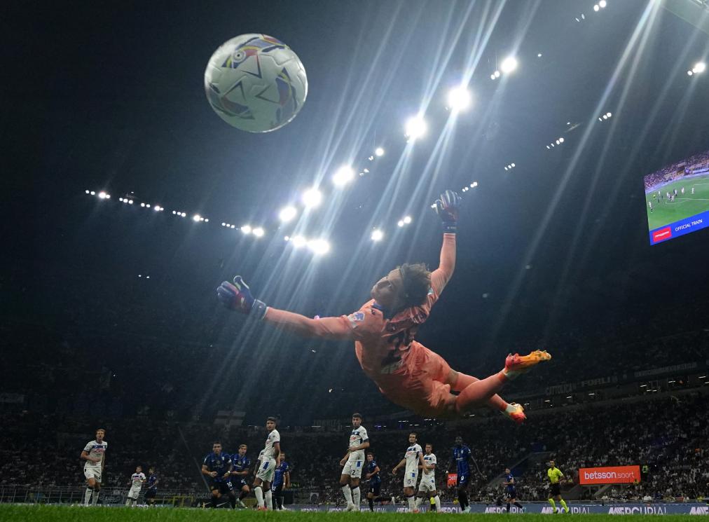 8月30日,亚特兰大队守门员卡尔内塞基(前)未能扑出国际米兰队球员巴雷拉的射门。新华社发(阿尔贝托·林格利亚摄)