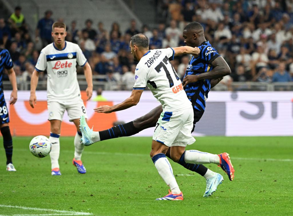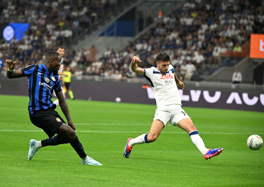 8月30日,国际米兰队球员图拉姆(左)与亚特兰大队球员吉姆西蒂在比赛中拼抢。新华社发(阿尔贝托·林格利亚摄)