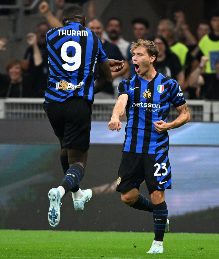 8月30日,国际米兰队球员巴雷拉(右)与队友图拉姆庆祝进球。新华社发(阿尔贝托·林格利亚摄)