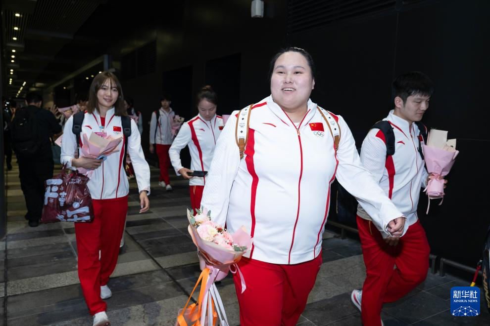 8月31日,举重运动员李雯雯(前)在欢迎仪式上。