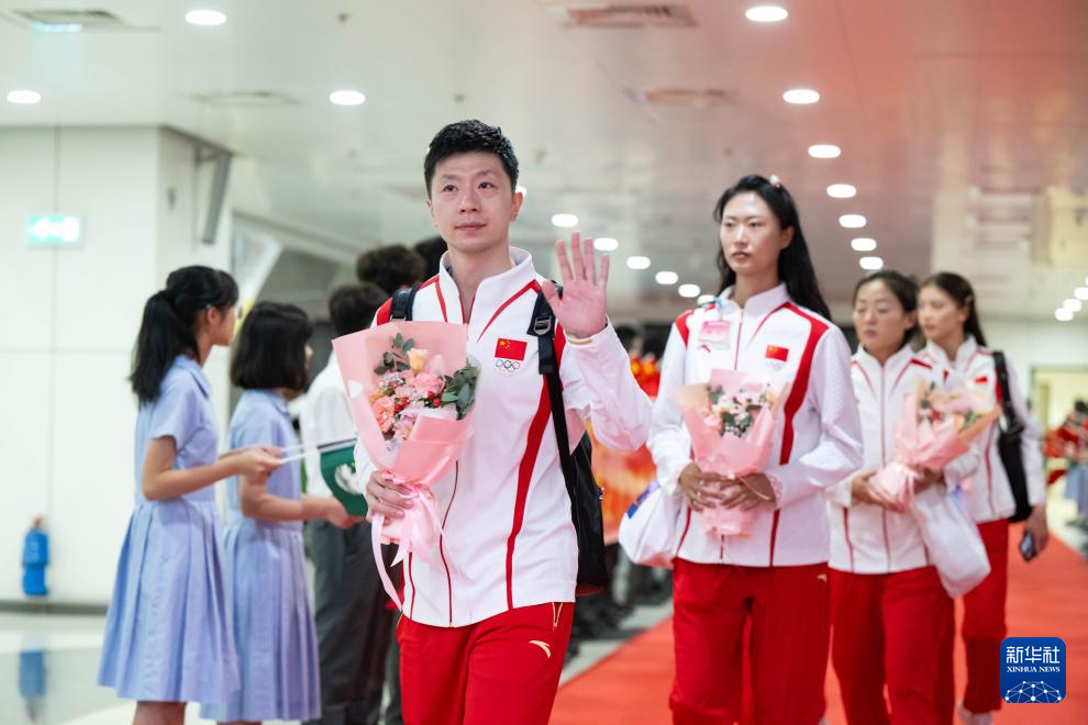 8月31日,乒乓球运动员马龙(前)在欢迎仪式上。