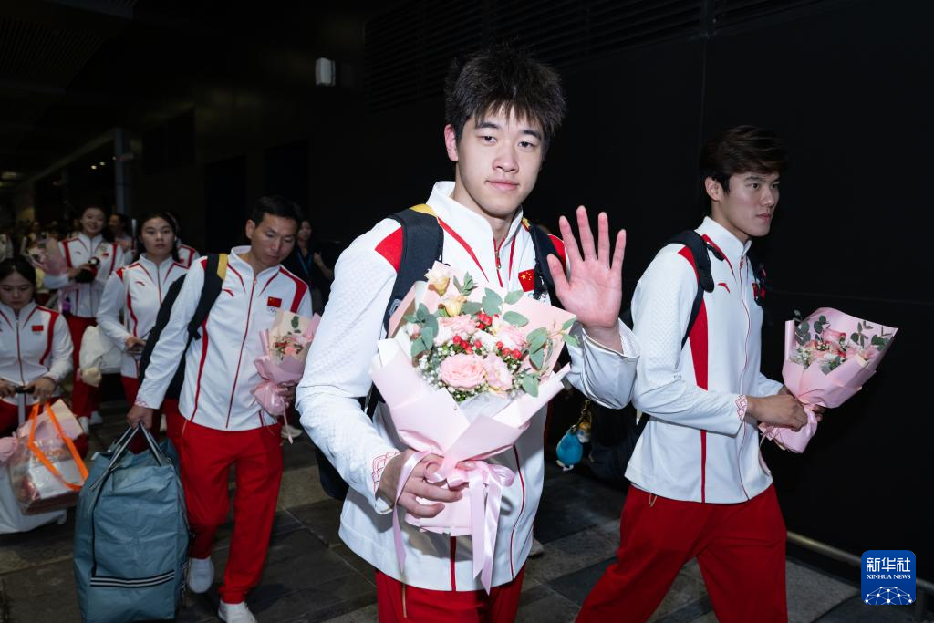 8月31日,游泳运动员潘展乐(前)在欢迎仪式上。